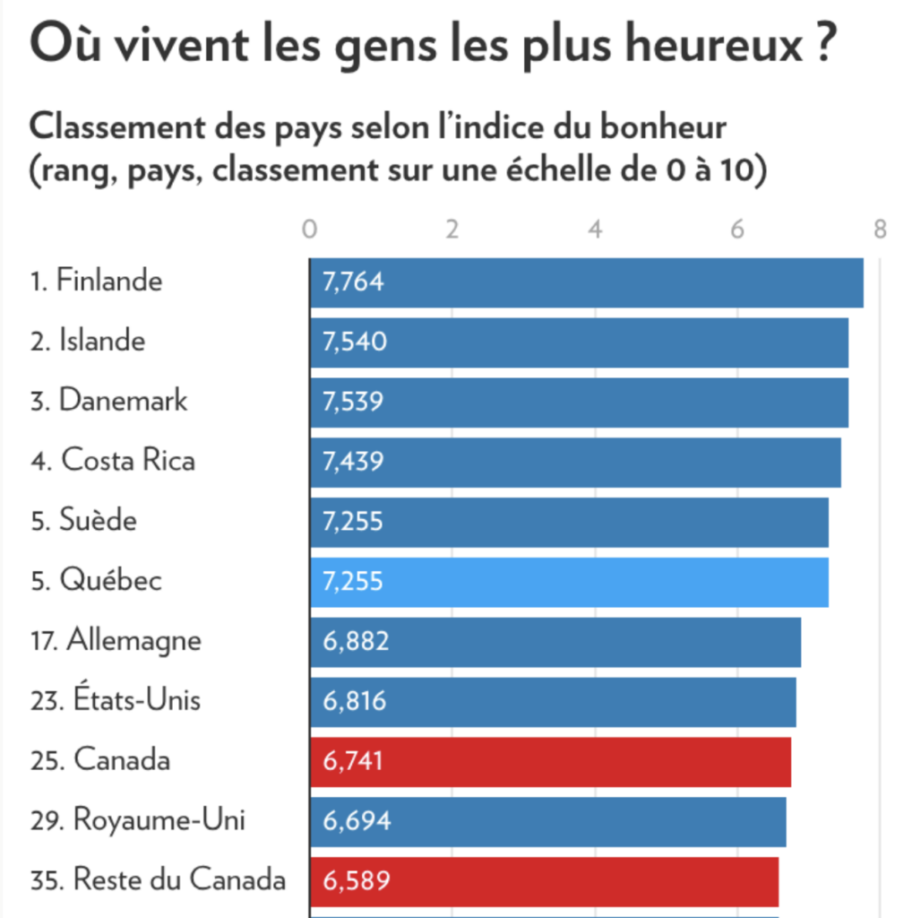 Avec un indice de bonheur de 7,255 sur 10, le Québec se hisserait au 5e rang mondial, à égalité avec la Suède. Un résultat remarquable… surtout quand on le compare au reste du Canada.