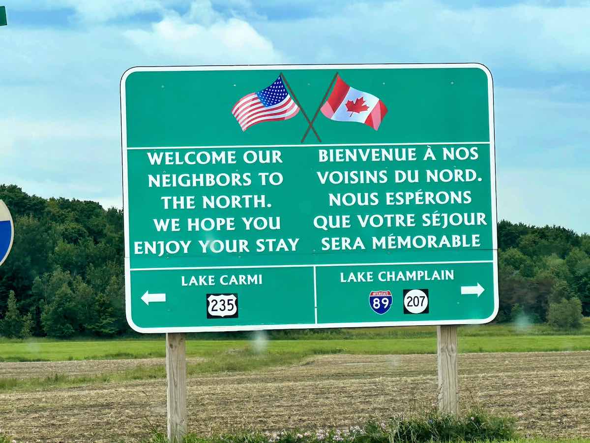 Si j’ai bien compris, il s’agit de citoyens américains qui se rendent au Québec. Sur la panneau, écrire « nos voisins du sud » serait à mon sens plus pertinent. Pareil pour « Lac » au lieu de « Lake ». Dans tous les cas, bienvenue au Québec !